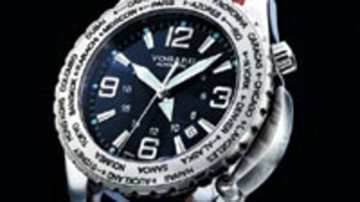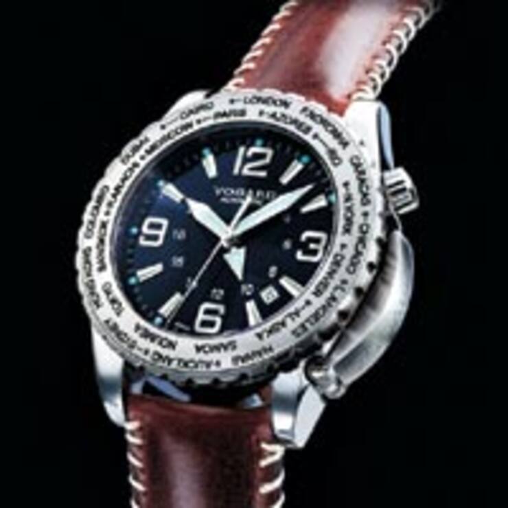 Die Weltzeituhr von Vogard mit mechanischem Werk macht die Umstellung auf andere Zeitzonen so einfach wie noch nie: Ein Dreh an der Lünette genügt.