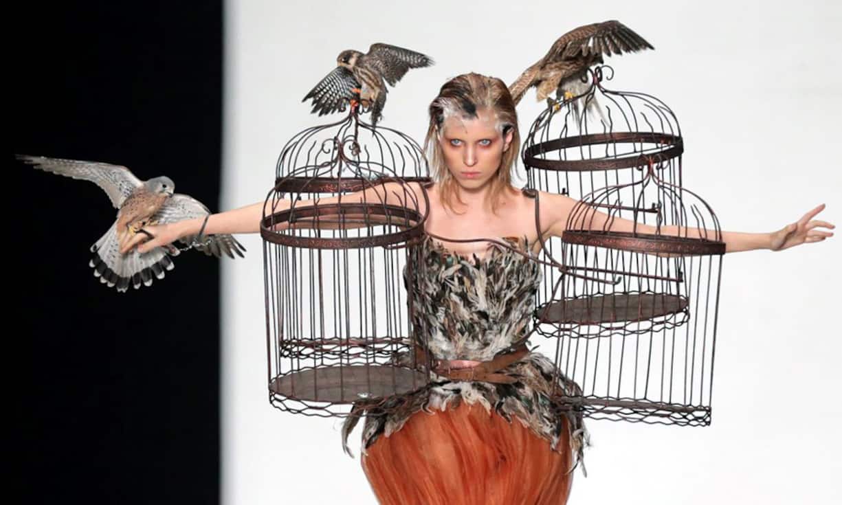 Moskau, Russland (Oktober 2013): Die Künstlerin Julia Cesar hat sich etwas Spezielles einfallen lassen: Sie schickt ihr Model mit Vogelkäfigen auf den Laufsteg.