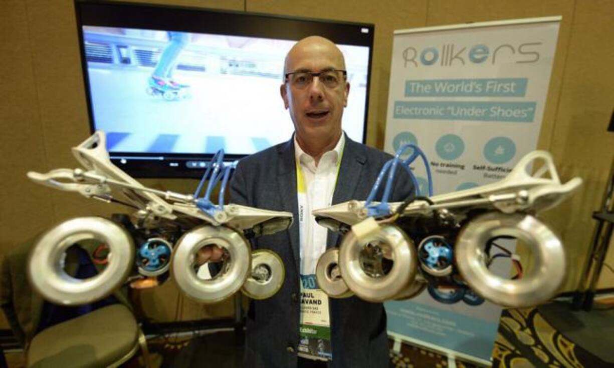 Elektronische Rollschuhe Die französische Firma Rollkers hat «Unterschuhe» entwickelt, mit denen die Fussgänger dank Elektromotor mühelos vorwärts gleiten.