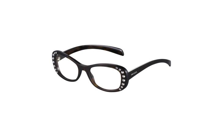 Üppig: Prada (Frau). Mit einer schmalen Silhouette und Verzierungen entlang der abgerundeten Kontur ist diese eigenwillige Brille in den Varianten Schwarz, Schildpatt und Elfenbein erhältlich. Preis 583 Franken